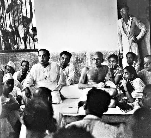 তরুণ ছাত্রনেতা শেখ মুজিবুর রহমান (পিছনে দাঁড়িয়ে) এবং কোলকাতায় মহাত্মা গান্ধীর সঙ্গে হোসেন শহীদ সোহরাওয়ার্দী। হিন্দু-মুসলিম সাম্প্রদায়িক দাঙ্গার (1947) বিরুদ্ধে মহাত্মা গান্ধীর প্রতিবাদকে সমর্থন করার জন্য তারা সেখানে ছিল।